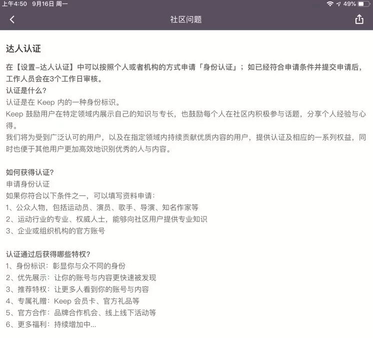 从Keep的达人认证说明中可以看出,Keep把达人分为了三层,由上到下分别是公众人物(明星)、运动行业的专业权威人士(KOL)、企业或者组织机构的官方账号。