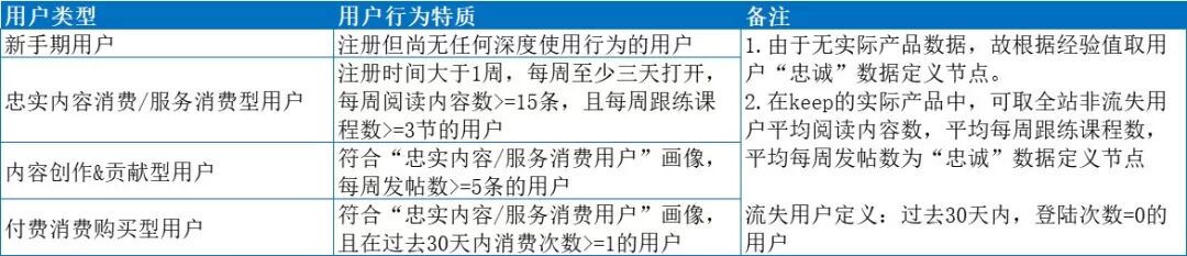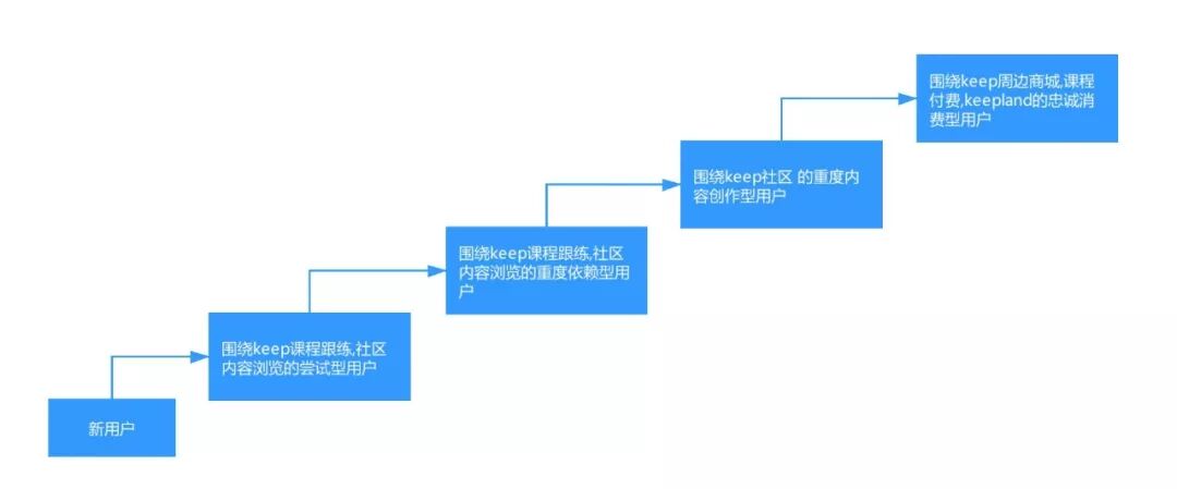 在产品中分别对应Keep社区业务模块用户、健身课程工具业务模块用户、消费商城业务模块用户,对这三类用户也可以再做细分。