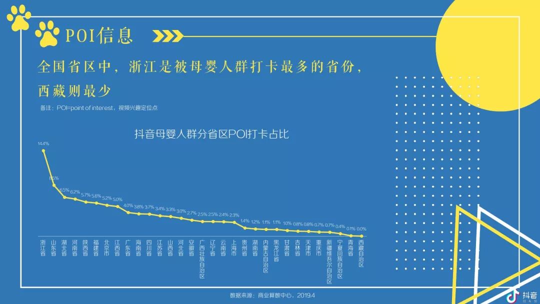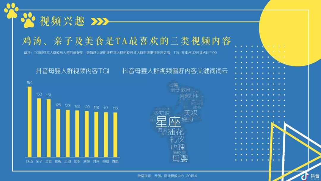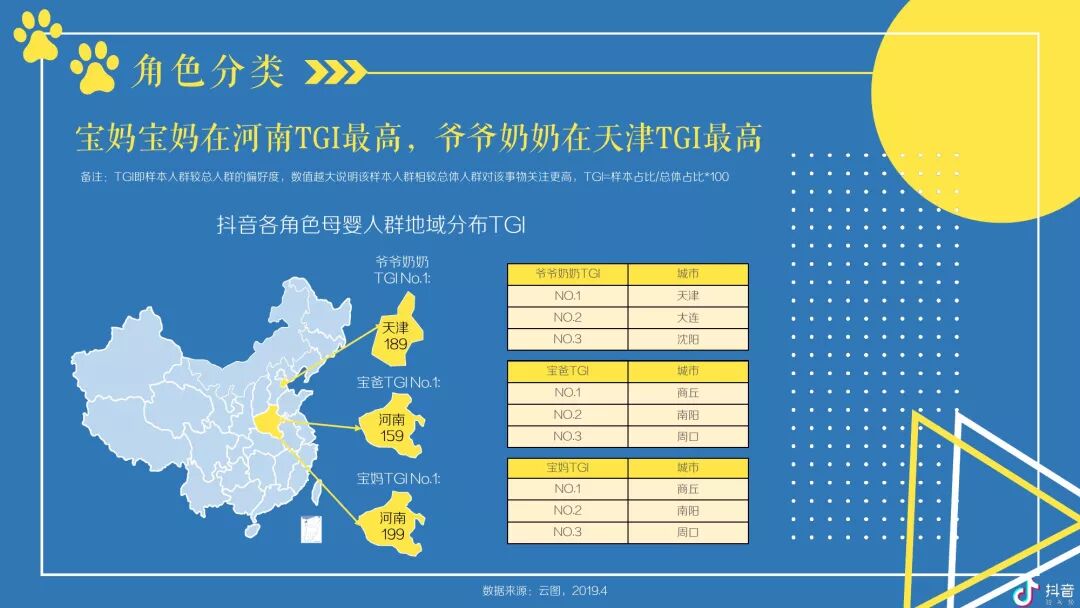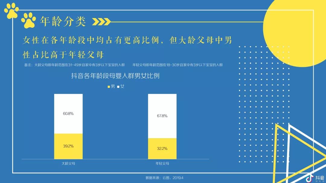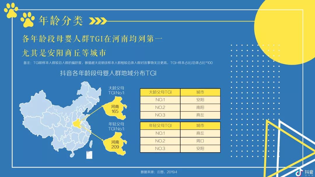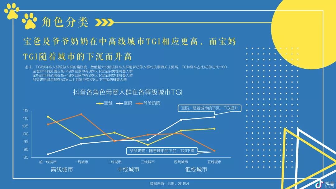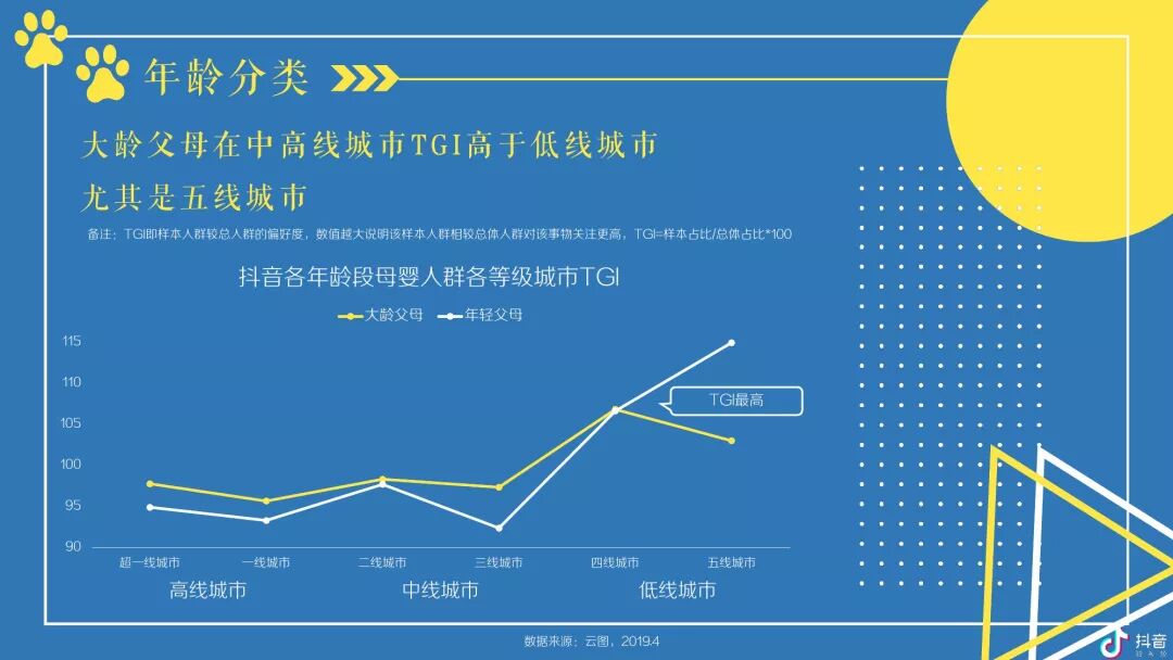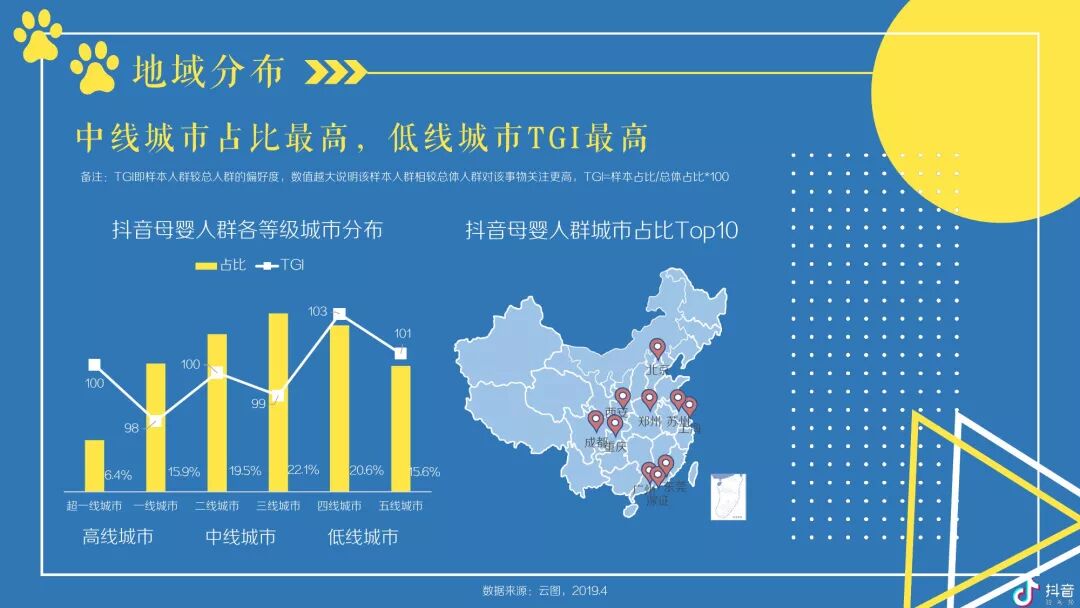 抖音母婴群体主要以女性为主体且以中青年为主,并在中低线城市拥有较高占比及TGI -