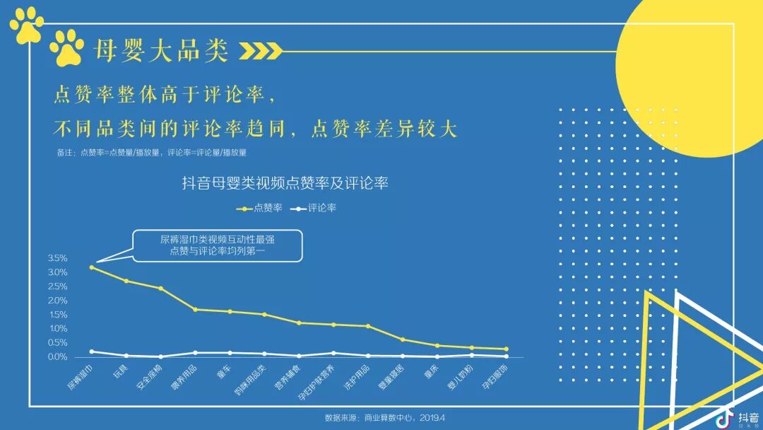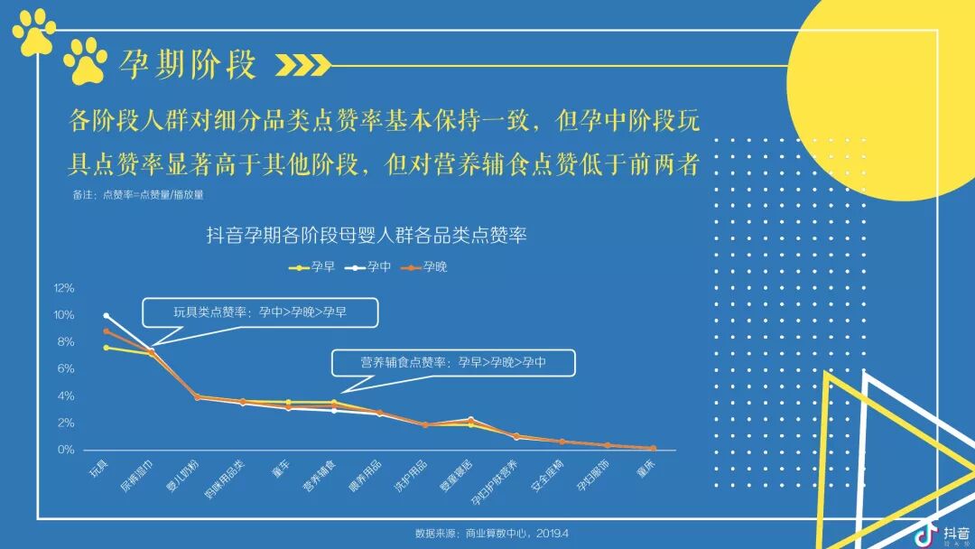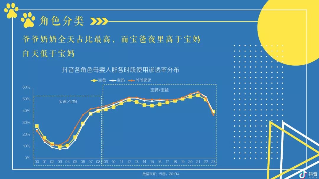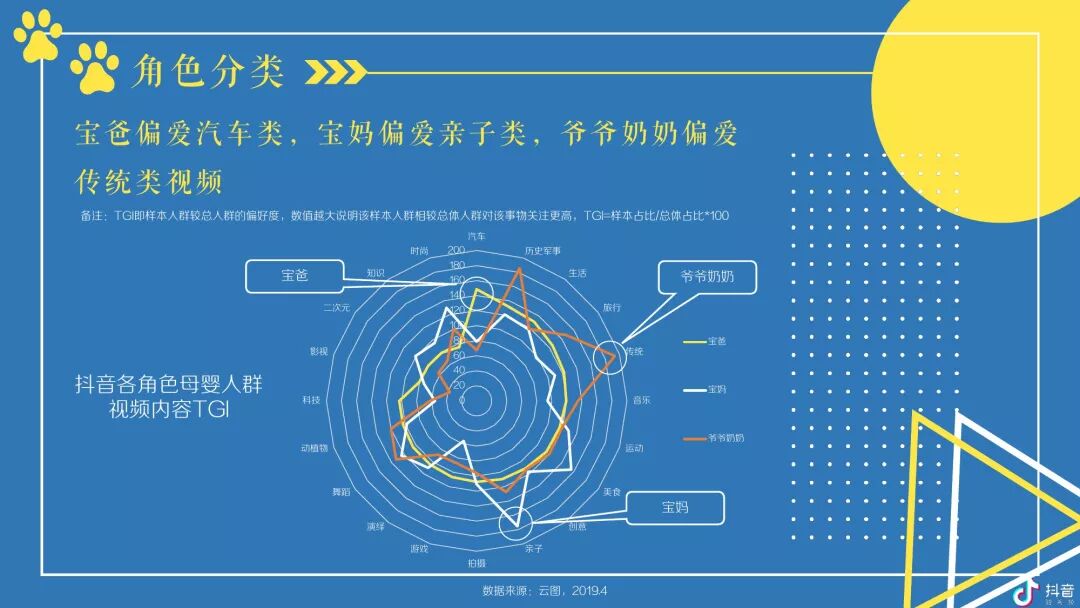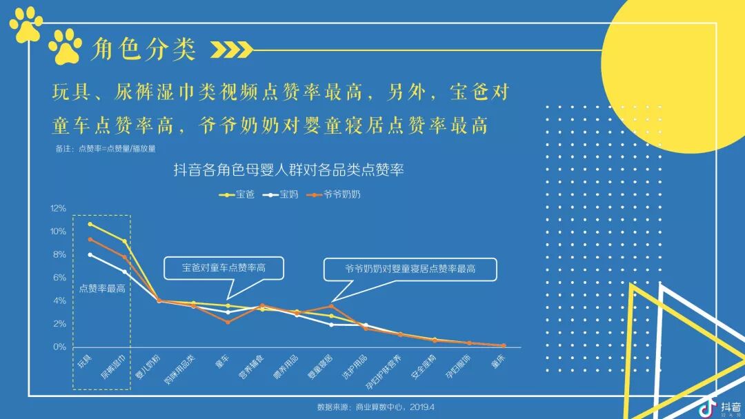 按角色区分,抖音母婴群体,宝爸及爷爷奶奶在高线城市TGI更高,宝妈则随着城市的下沉而上升;对于视频内容,宝爸偏爱汽车,宝妈偏爱亲子,爷爷奶奶偏爱传统;玩具、尿裤湿巾类视频点赞率最高