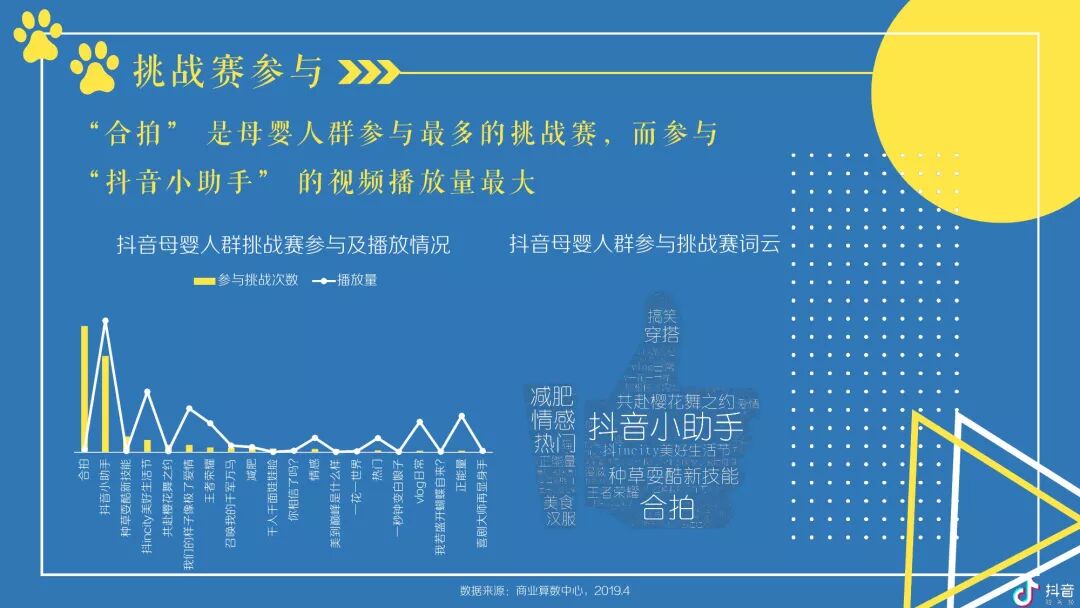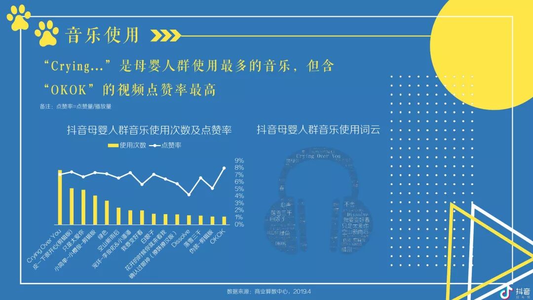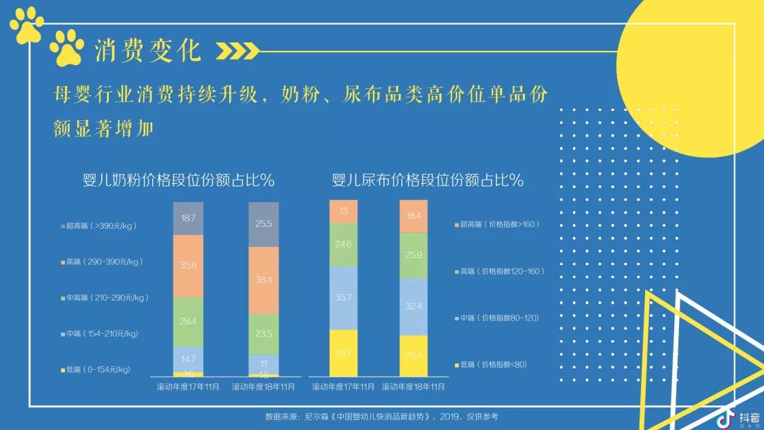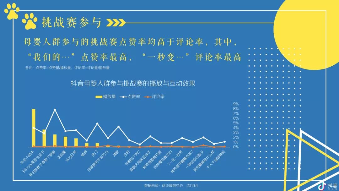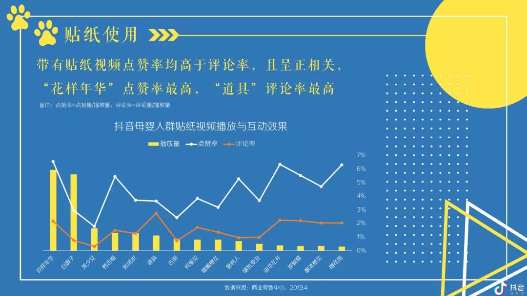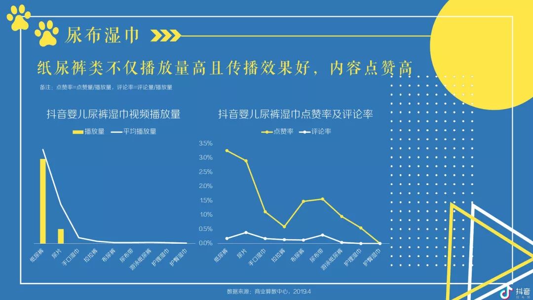 按角色区分,抖音母婴群体,宝爸及爷爷奶奶在高线城市TGI更高,宝妈则随着城市的下沉而上升;对于视频内容,宝爸偏爱汽车,宝妈偏爱亲子,爷爷奶奶偏爱传统;玩具、尿裤湿巾类视频点赞率最高