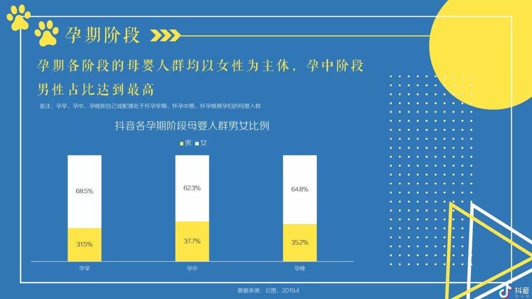 按阶段区分,孕期各阶段母婴群体均以女性为主,但在孕中期男性比例相对更高,孕早期人群在超一线城市TGI更高,其他阶段人群均在低线城市TGI更高,对于内容,孕早及孕晚偏好亲子、美食而孕中偏爱鸡汤类 -