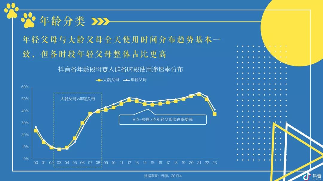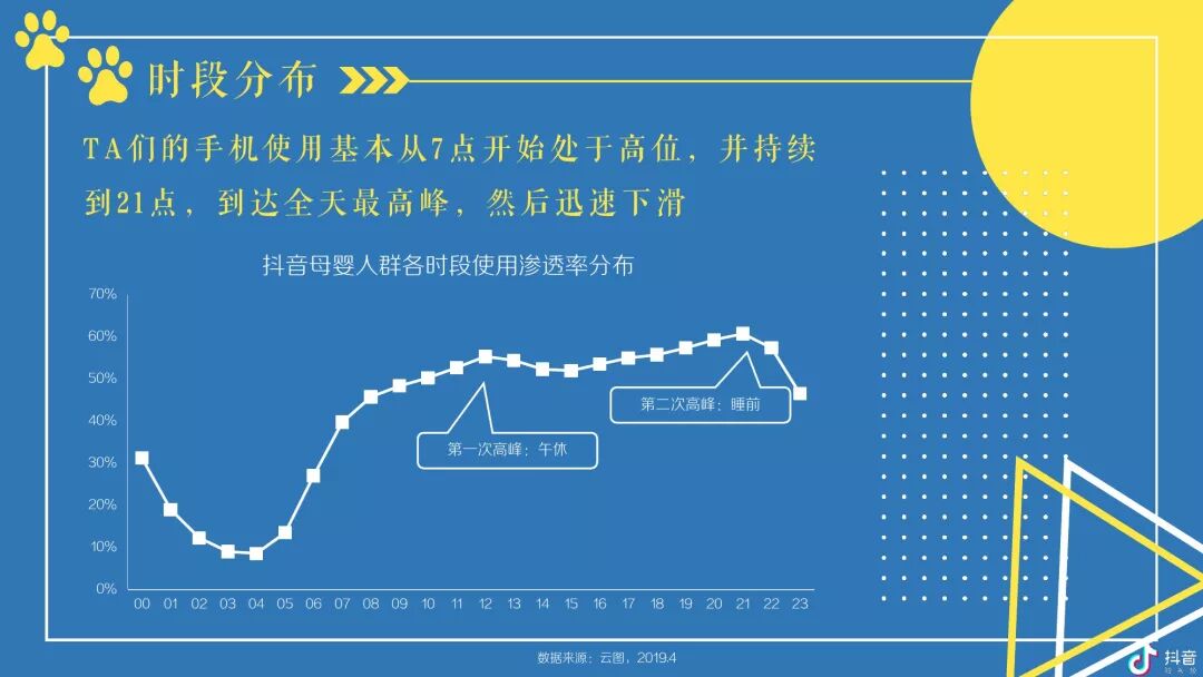 抖音母婴群体在7点开始进入全天使用高峰并一直持续到22点,内容方面偏好鸡汤、亲子及美食