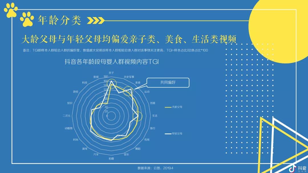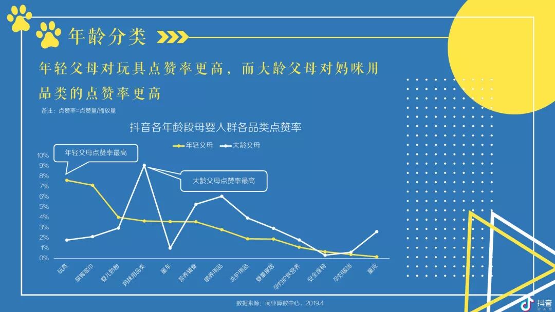 按年龄区分,抖音母婴群体,男性在大龄父母群体占比更高,大龄父母在各线城市TGI均低于年轻父母,同时,二者在低线城市TGI更高,年轻父母更爱点赞玩具类视频,大龄父母则爱点赞妈咪用品类 -