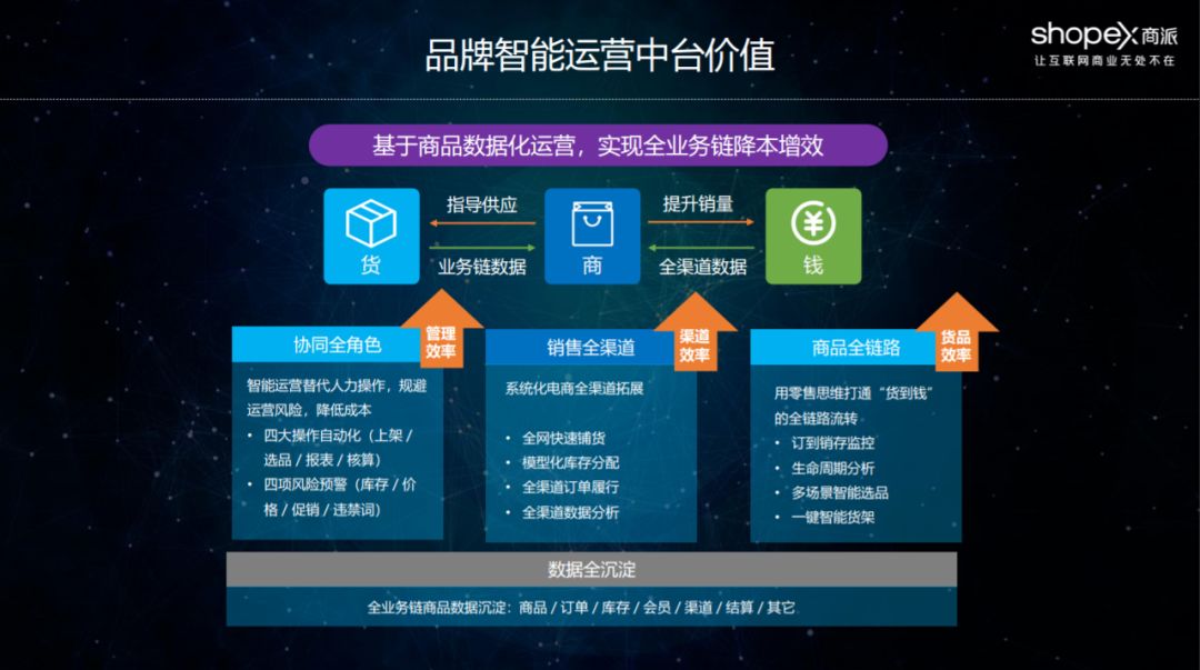 作为商派oneX的核心产品之一,“品牌智能运营中台”是商派联合知名的电商代运营服务商共同打造的。该智能运营中台是基于实操后端管理经验,把管理流程直接加载为系统流程,有效保障货品、商品、库存、财务的整体运转效率。其核心目的是用商品的全链路数据,提升品牌电商全渠道零售效率,降低企业的商品运营成本。