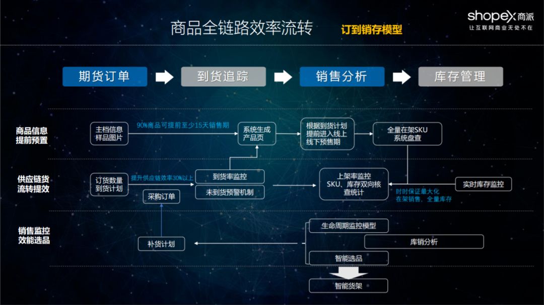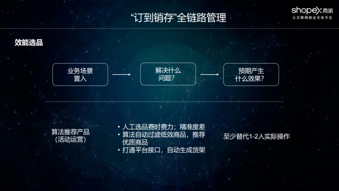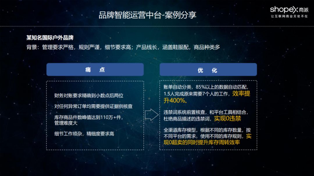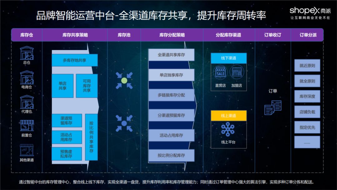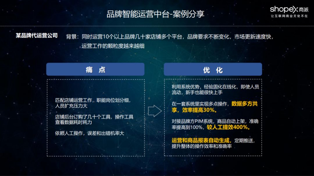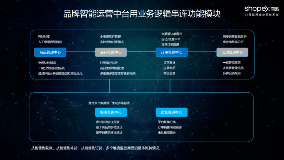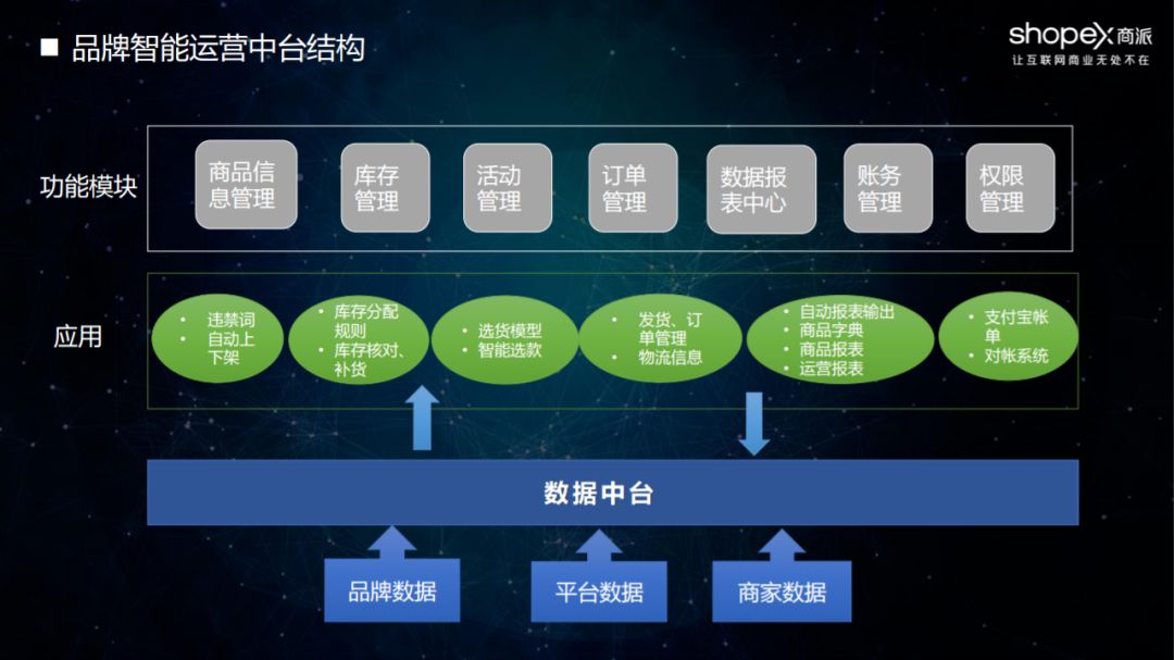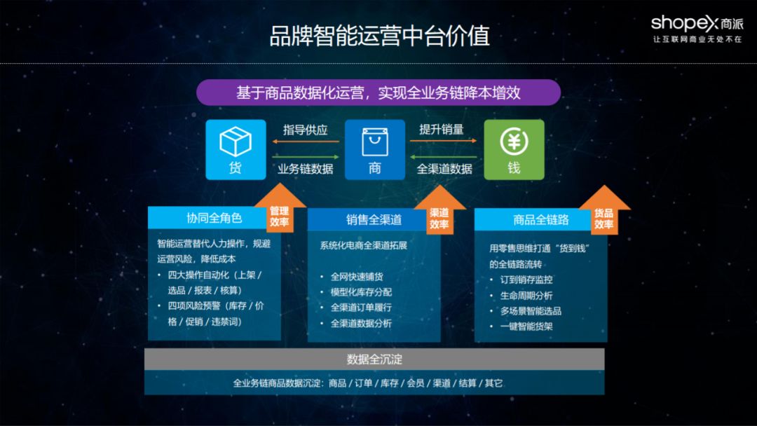作为商派oneX的核心产品之一,“品牌智能运营中台”是商派联合知名的电商代运营服务商共同打造的。该智能运营中台是基于实操后端管理经验,把管理流程直接加载为系统流程,有效保障货品、商品、库存、财务的整体运转效率。“品牌智能运营中台”适合多渠道商品运营的品牌电商部门,以及电商代运营公司。帮助他们用商品的全链路数据,提升品牌电商全渠道零售效率,降低企业的商品运营成本。