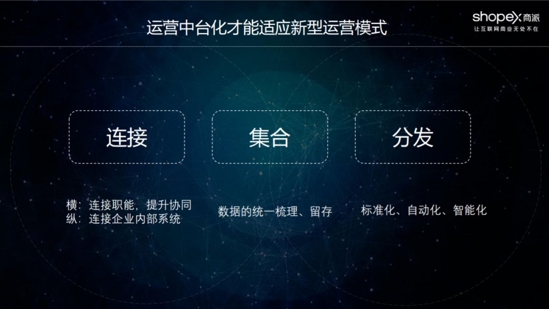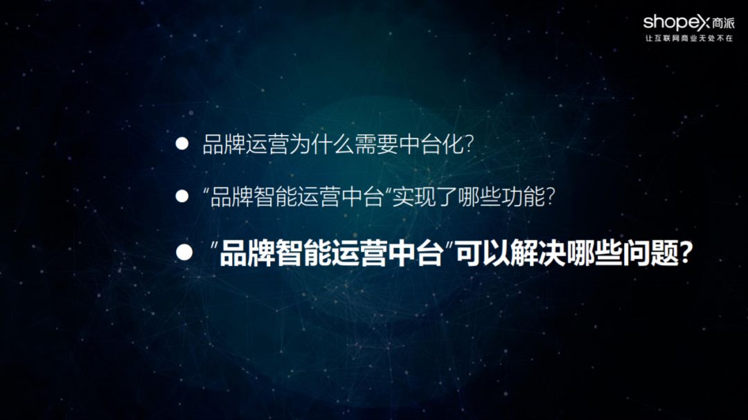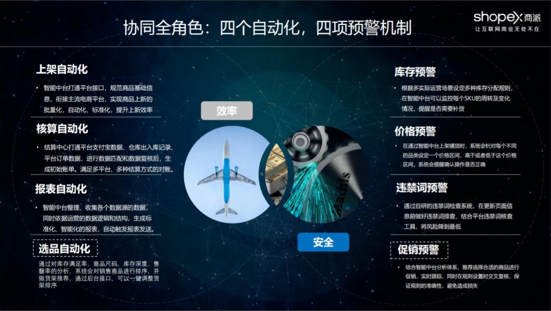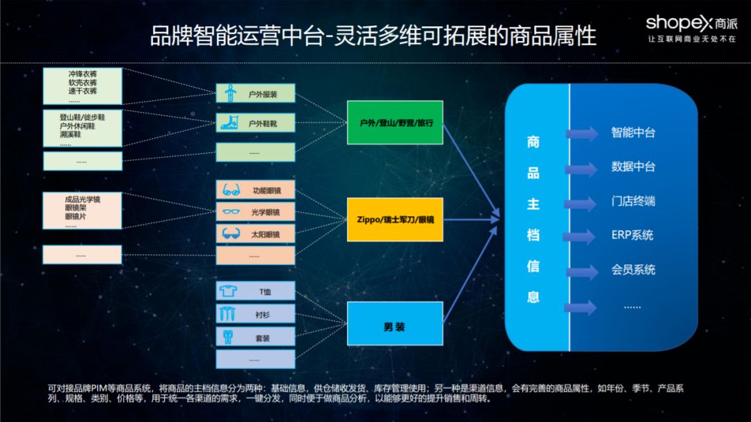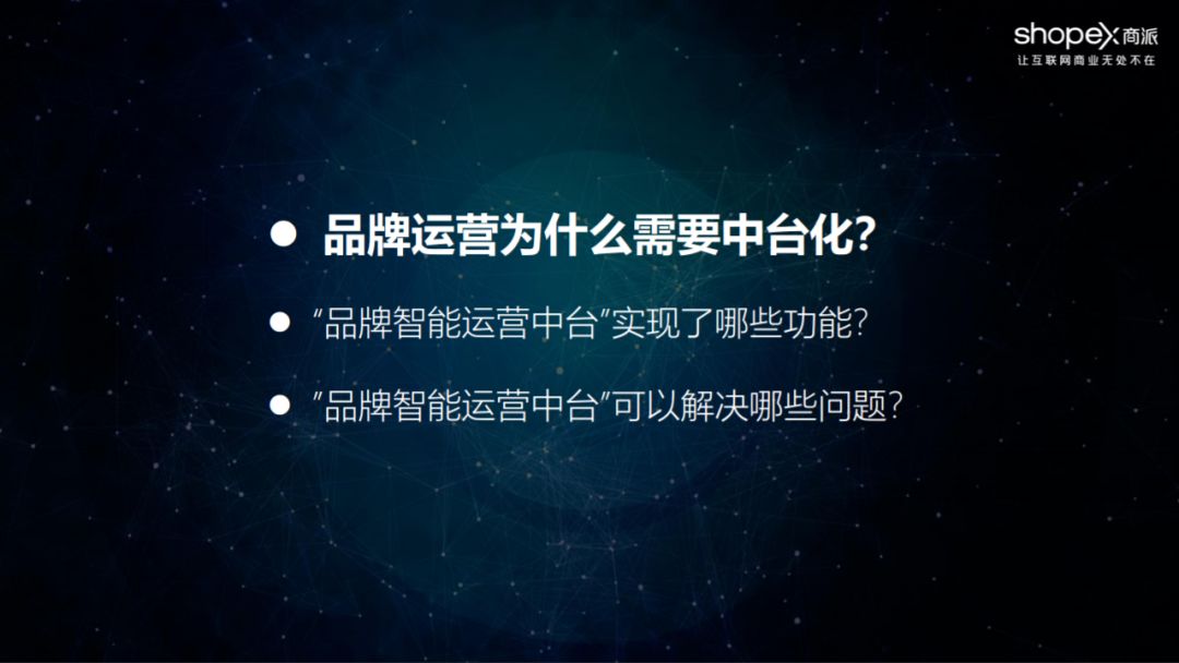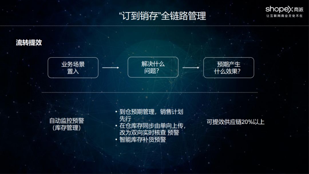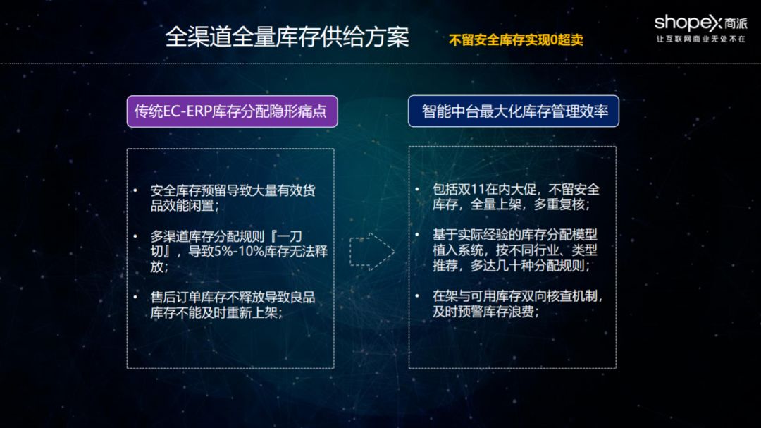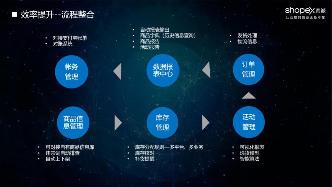 作为商派oneX的核心产品之一,“品牌智能运营中台”是商派联合知名的电商代运营服务商共同打造的。该智能运营中台是基于实操后端管理经验,把管理流程直接加载为系统流程,有效保障货品、商品、库存、财务的整体运转效率。“品牌智能运营中台”适合多渠道商品运营的品牌电商部门,以及电商代运营公司。帮助他们用商品的全链路数据,提升品牌电商全渠道零售效率,降低企业的商品运营成本。