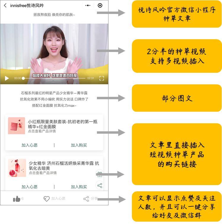 品牌电商小程序平台内的内容,应侧重于辅助购买流程,促使下单转化。因为已经进入到品牌小程序的用户“购买意向”比较明确,从用户打开小程序到完成下单过程中,种草文章里的图文、短视频、商品评价、产品问答等信息都是帮助用户完成购买决策的。