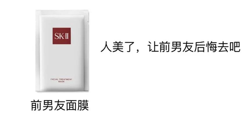 比如,sk2美白精华,用完之后皮肤像灯泡一样亮;前男友面膜,敷了之后,人美了,让前男友后悔去吧。