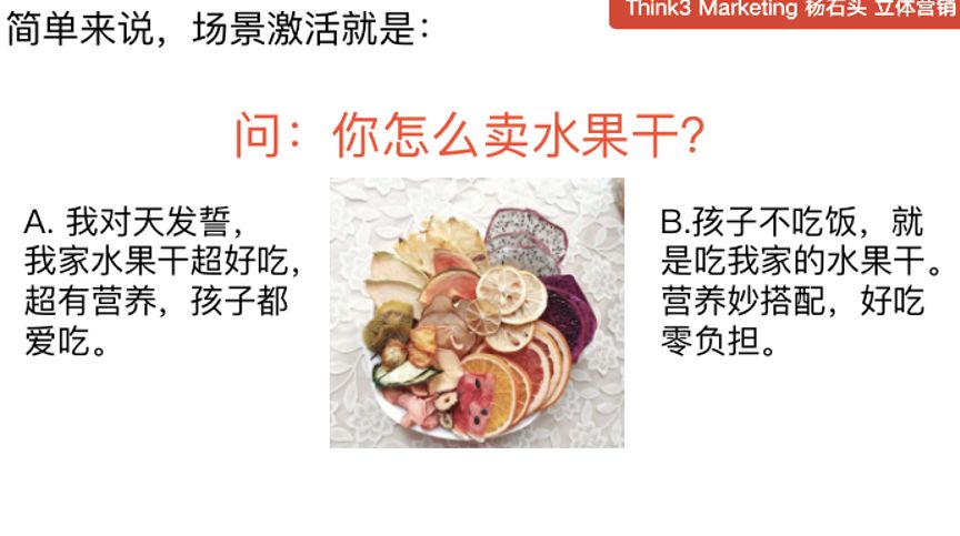 给用户制造刚需。比如说买水果干,如果以告知方式,对用户说,“我家水果干是有机的,超有营养。” 用户反而会产生怀疑。但如果换一种表述,“孩子不吃饭,就吃我家水果干。营养又美味,好吃无负担。配粥和米饭都是极好的”。激活了“不吃饭”这个场景,用户就会产生购买的意图。