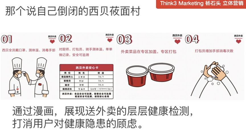 比如,最近正在风口的西贝筱面村,通过漫画展现外卖消毒流程,打消用户对健康隐患的顾虑。