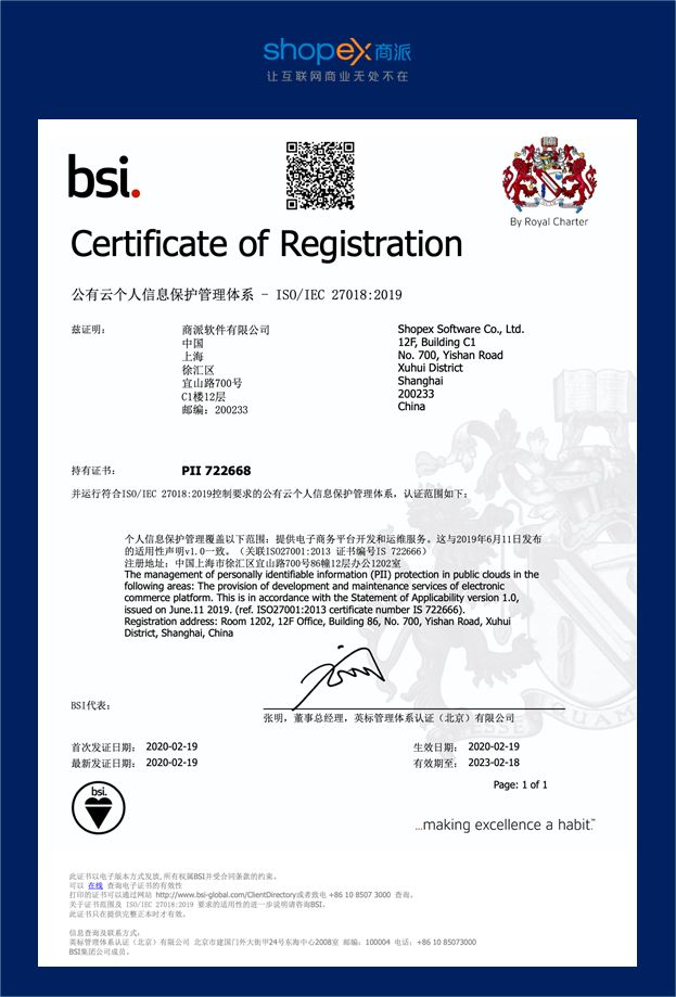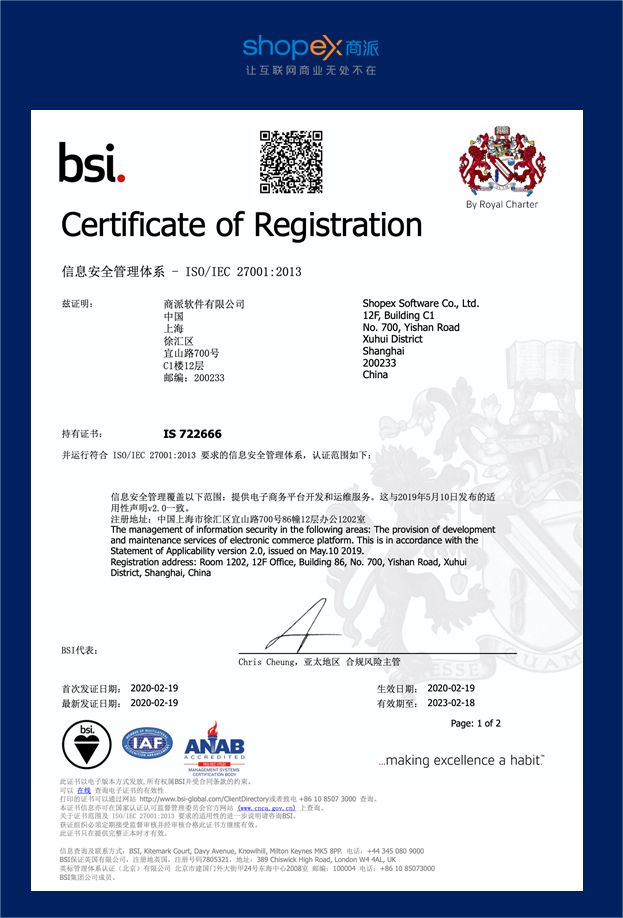 2月19日,商派在“提供电子商务平台开发和运维服务 ”领域/范围,同时获得了英国标准协会(BSI)旗下英标管理体系认证(北京)有限公司的信息安全管理体系认证(ISO27001)和公有云个人信息保护管理体系(ISO27018)认证;中国国家认证认可监督管理委员会官方网站可以查询到相关的认证信息。