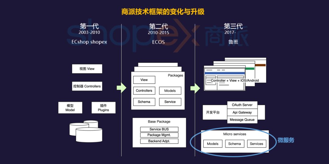 商派之所以有完整的前后台产品, 是因为基于一套自研开发框架(ECOS)降低了开发成本。该框架采用类似OSGI的设计思路, 在应用内实现服务化与组件化。并在电商场景下实现订单、商品、会员等在各个业务系统中的模型一致性。