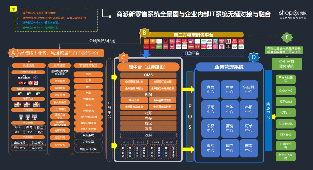 在商派的解决方案当中,经常能打动客户的往往是商派的软件产品可以成为一个中间“路由器”,把客户企业其他3-5个系统串联起来,通过这个“路由”进行编码翻译,让企业原本无法串联的系统也能实现数据和流程的对接。