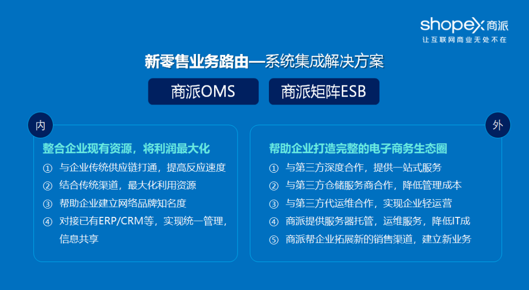 也正是由于很多零售企业遇到这类情况,才有了现在的“新零售业务路由”解决方案,该方案是基于商派OMS和商派矩阵ESB结合的“系统+服务”数字化解决方案。