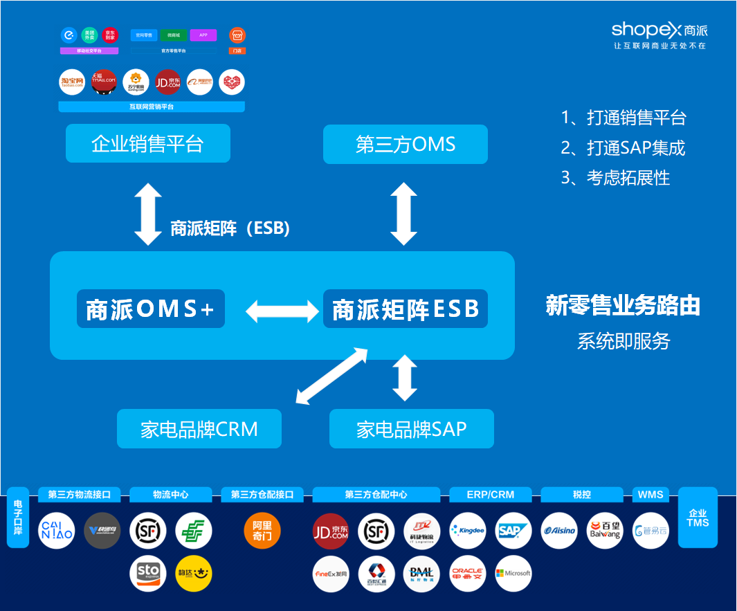 保障商派OMS进行前端和后台无缝连接的则是商派矩阵ESB,以及拥有大型IT项目实践的技术团队。系统即服务,往往比的就是资源和经验。