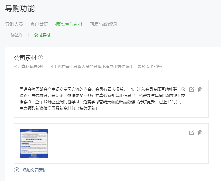 公司在公众后台编辑素材库,有文字、图片、小程序3种,各支持添加50组素材。导购在导购助手小程序选择相应素材,省时省力,也提升了客户回应效率。