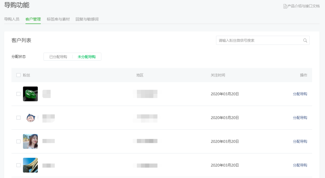 1)商户端:公众号后台,开通导购助手,添加导购,为粉丝分配导购;
