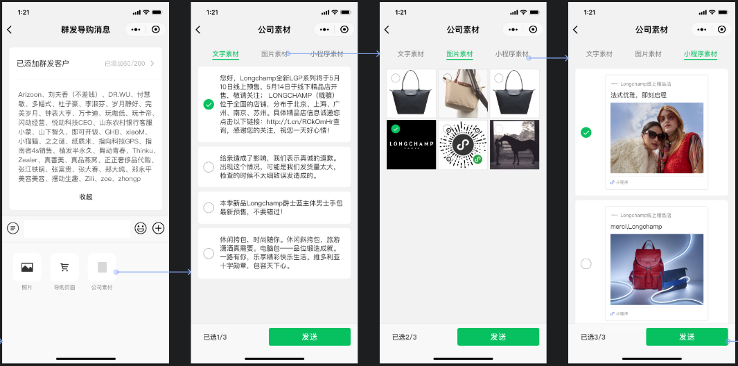 4)群发,导购按照客户标签统一发布定制化内容,降低了消息发布成本