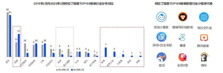 上榜数量前三的行业分别是网络购物、游戏和政务公益,政务公益类小程序上榜数量创历史新高。