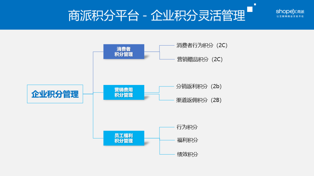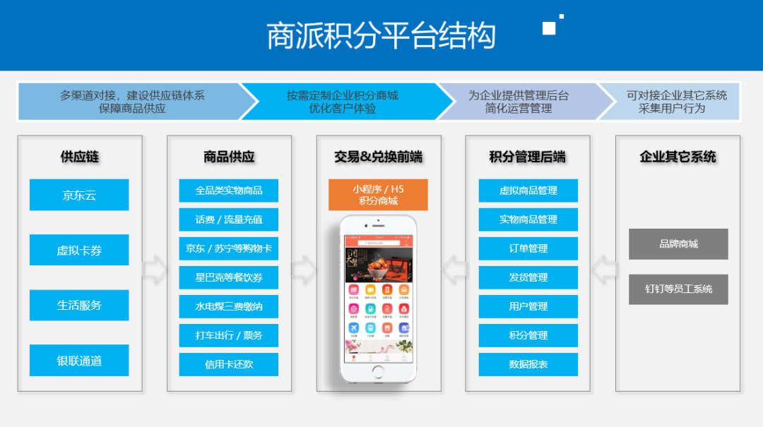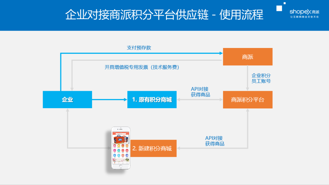 为了满足企业“开源节流”的需求,商派整合强大的商品供应链资源,IT系统资源,打造了企业积分商城平台,该平台主要分为两个业务板块:标配的积分商城和企业福利积分化。