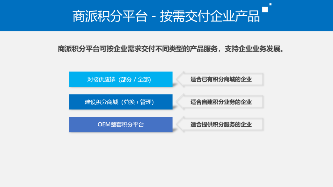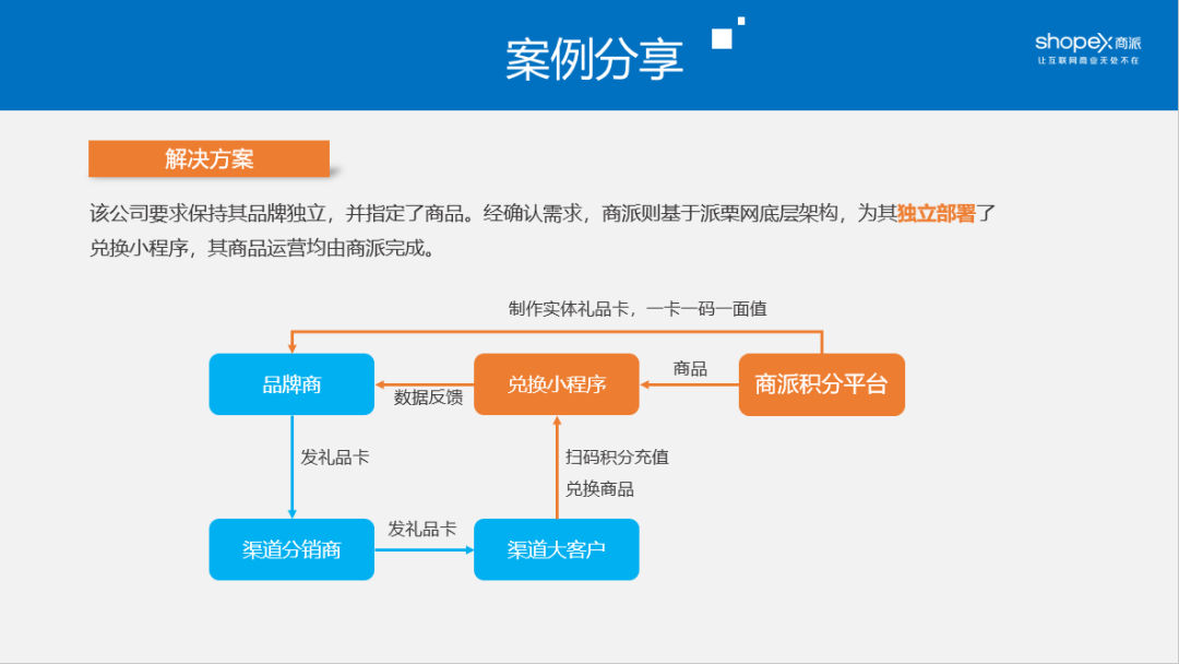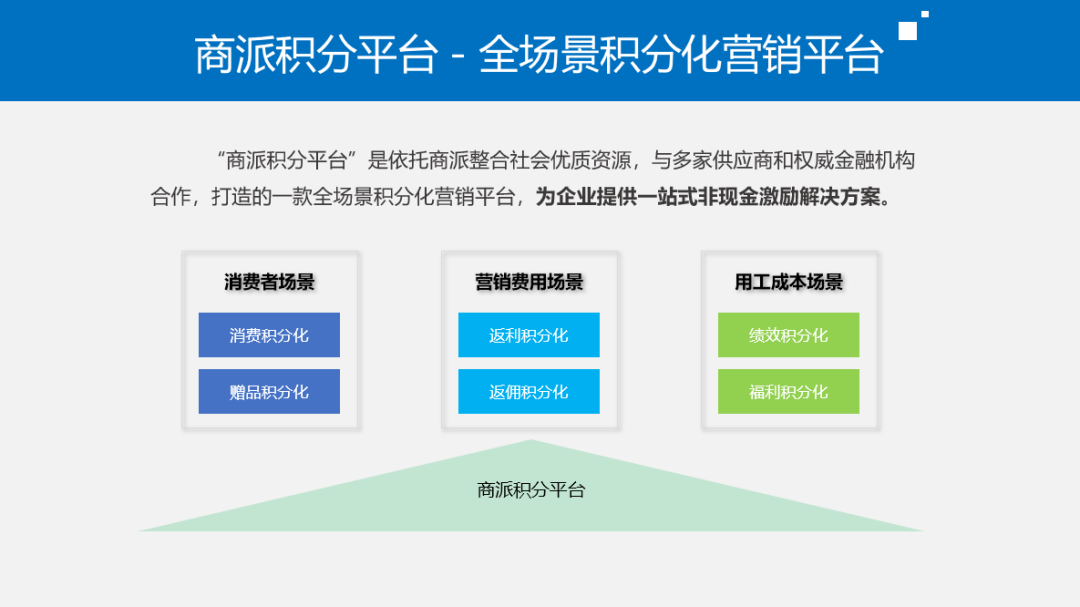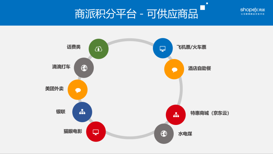“商派企业积分平台”是依托商派整合社会优质资源,与多家供应商和权威金融机构合作,打造的一款全场景积分化营销平台,为企业提供一站式非现金激励解决方案。