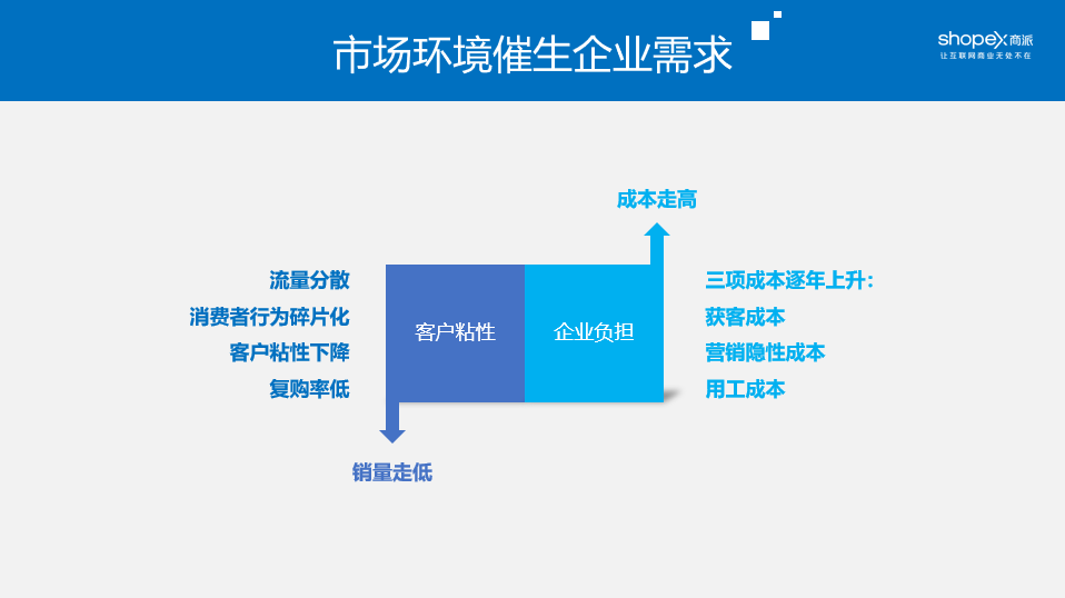 目前,企业的获客成本、营销隐性成本、用工成本等都是持续走高的,加大了企业的负担。同时,由于当下的流量分散,消费者的行为更加碎片化,导致客户对于品牌的粘性也下降了,复购率变低了,整体销量也因此走低。