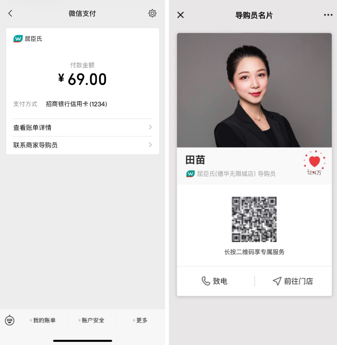 2019年11月,屈臣氏试点上线了微信支付的“支付即服务”能力,当用户在门店用微信支付买单后,基于当下导购和顾客的服务关系,在微信支付凭证上会直接展示此导购的名片,用户可轻松添加导购为好友,获得长期的服务。
