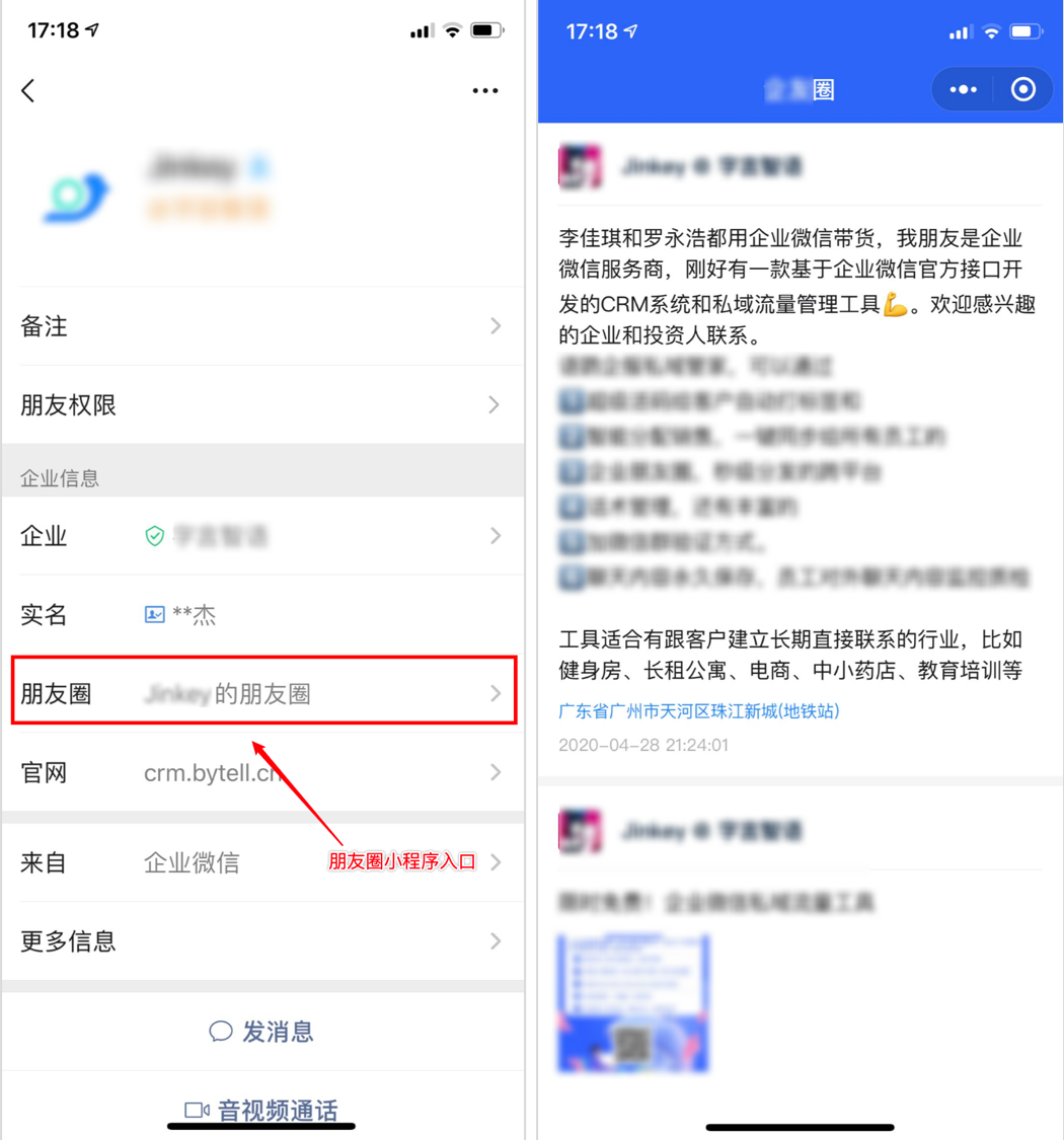 用户就可以通过名片展示页小程序入口,看到员工以前发布的朋友圈信息了(朋友圈内容实际上是要发布到这个“假朋友圈”小程序中的)。
