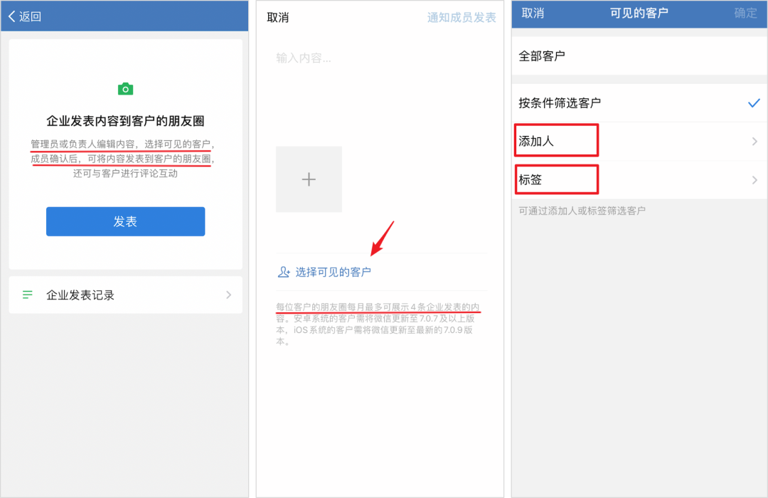企业微信发布内容到用户的朋友圈,需要管理员或负责人编辑内容,选择可见用户,当成员确认后才能把内容成功发送到用户的朋友圈,每个用户的朋友圈每月最多可展示 4 条。