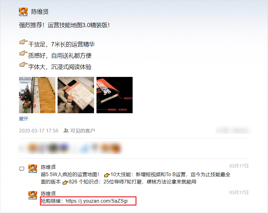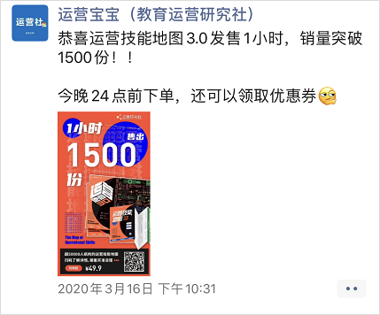 以《运营技能地图3.0》发售节奏为例,我们按照“产品预热→发售倒计时→产品发售→业绩战报→用户评价”这一套流程发布朋友圈,达到了一个非常不错的转化效果。