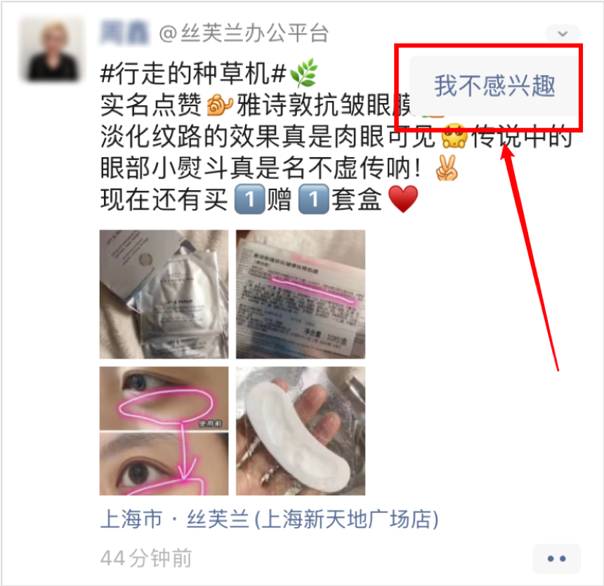 如果你发布的朋友圈内容影响到用户体验的话,很可能会让用户随手点击右上角“不感兴趣”的按钮。