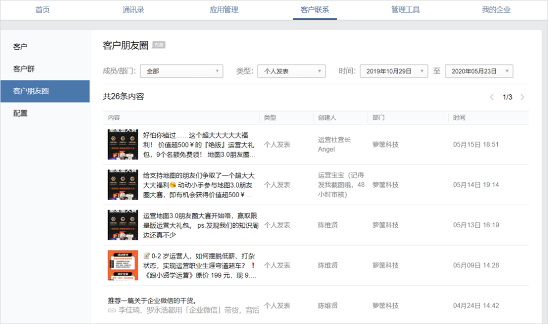 员工发布的企业微信朋友圈内容,企业管理员可以在后台可以统一查看和管理。