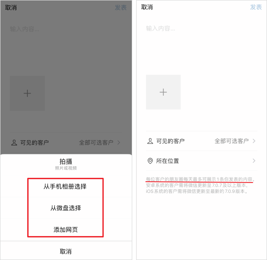 用企业微信发布的朋友圈,除了和微信朋友圈一样可以发送文字、图片、视频之外,还可以发布微盘文件以及网页链接。