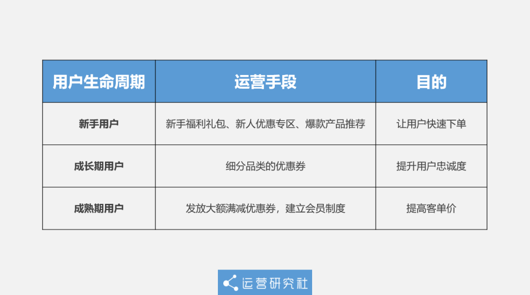对于成熟期的用户,我们可以发放大额满减优惠券,提升客单价。还可以建立会员制度,提高用户的忠诚度。