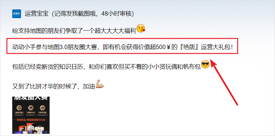 比如我们会在运营技能地图 3.0 的售卖过程中,举办朋友圈大赛活动,让用户自发分享自己的收获和使用体验。