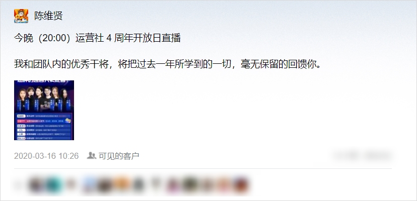 当你开通了企业微信的朋友圈功能后,就可以去客户的朋友圈“明目张胆”地打广告了,就像这样: