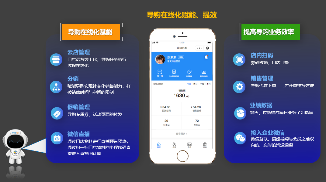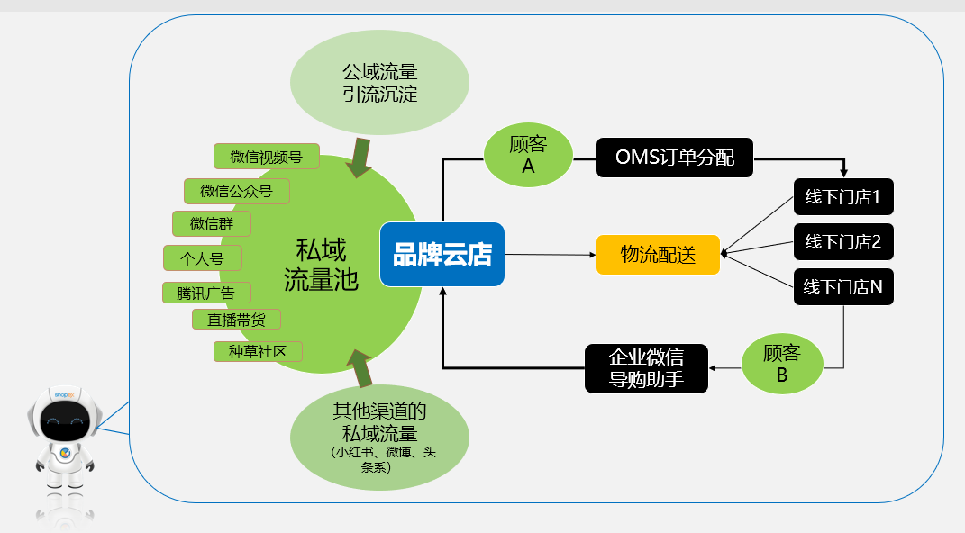 品牌云店加上智慧导购,实现连锁门店和导购业务的在线化、数字化与社交化,构建品牌私域流量经营阵地;再借助业务路由和中台系统,串联企业的主要IT系统,实现从总部到门店的“人货场”业务经营闭环。