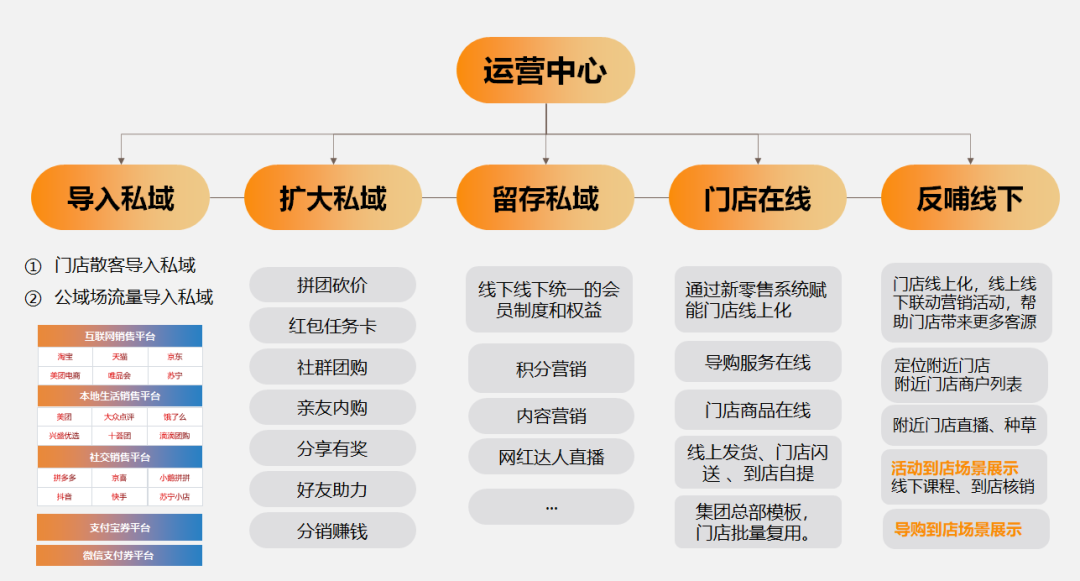 云店运营中心的流程逻辑也比较明确,就是导入私域——扩大私域——留存私域——门店在线——反哺线下,整体上一气呵成。