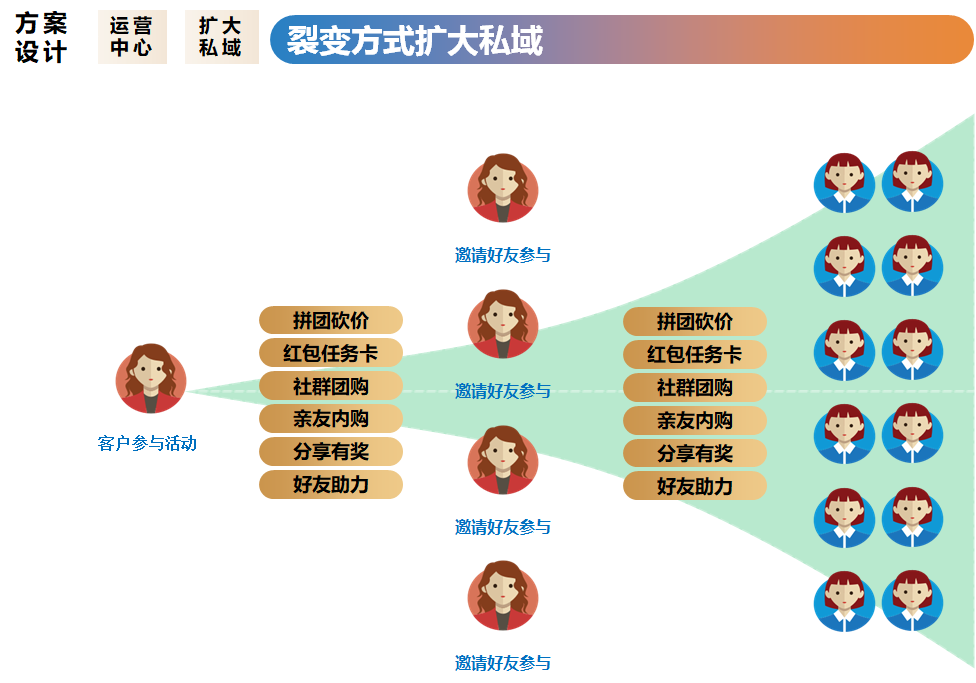 其次,私域流量池通过运营实现增长。主要的增长方式是通过“拼团秒杀、红包任务、社群团购、亲友内购、分享有奖等社交裂变方式扩大私域流量池。