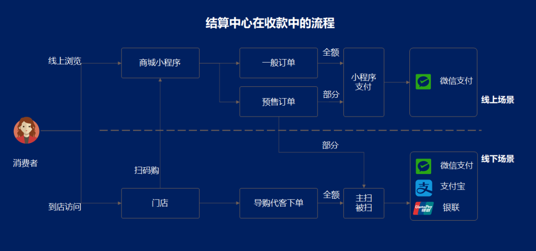 •线上/线下,扫码/被扫,支付宝/微信/银联,小程序,公众号