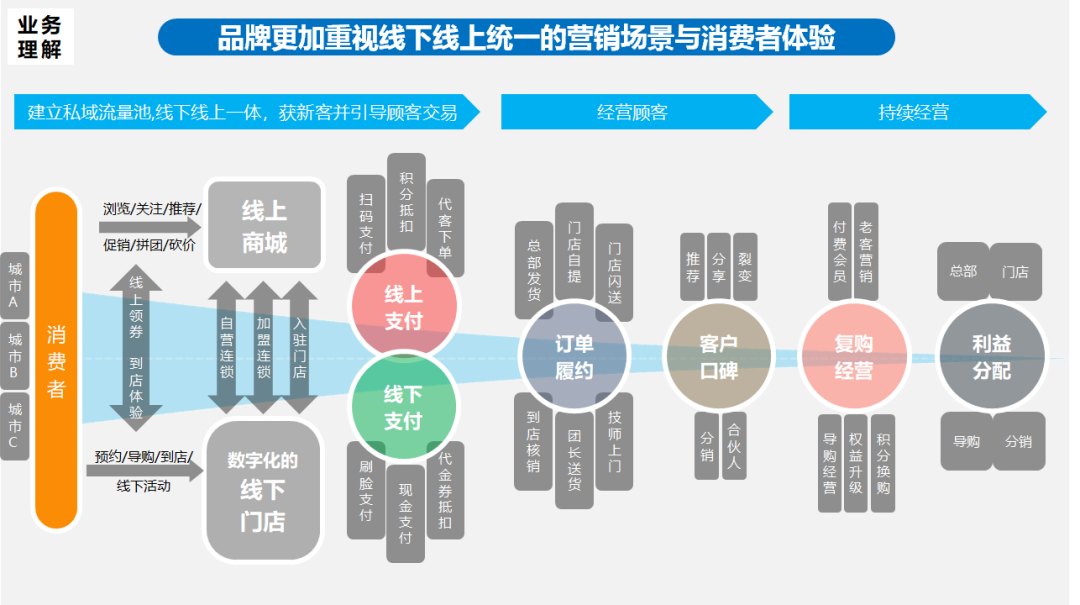 渠道融通当然是第一个!传统零售,其第三方电商平台业务,独立官方商城业务,经销商业务,门店业务等等,相互孤立,无法借力打力,形成了利益孤岛,只关注自身业务发展,无法形成协同。一步通则步步通!因此,多数零售企业的第一核心诉求就是渠道融通, 从孤岛型离散业务升级成为全域型协同业务。