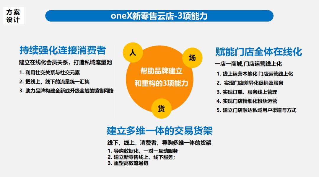 从零售“人货场”三要素的角度理解云店的3项能力则比较直接。人,如何强化连接和销售服务?货,如何缩短销售路径和提高展现?场,如何实现线上化、数字化,并精细化运营?——新零售云店对此都给出了对应的解决方案。