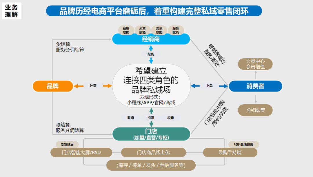其次是业务场景创新。“零售武功唯快不破”,企业通过快速创新零售场景,开展创新型业务,比如最近的直播带货,并赋能给经销商,门店,店员等各个销售端。