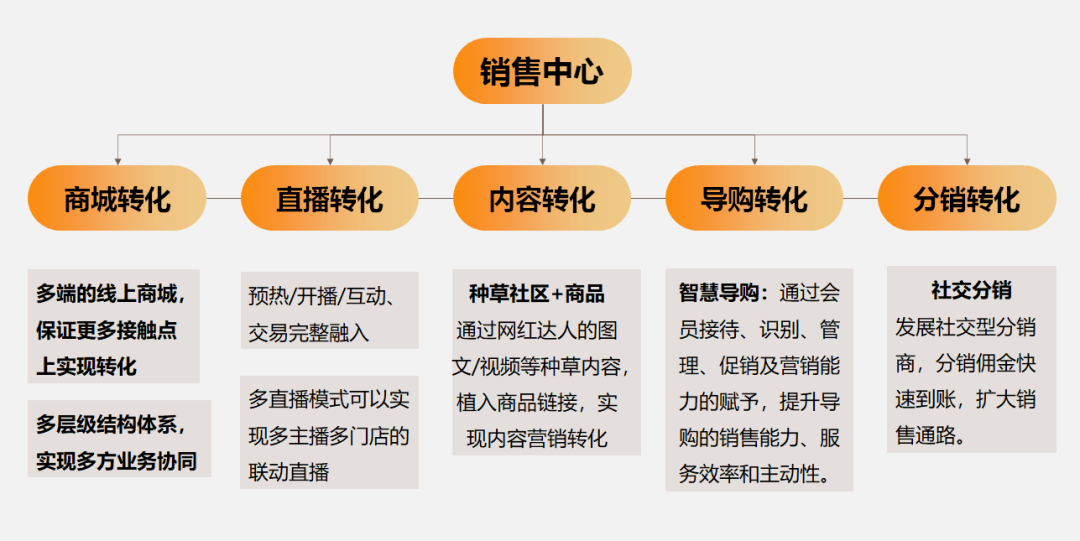 传统的微商城卖货,转化形式比较单一。新零售云店则是包含了多端多触点多模式的转化路径。在商城转化层面,不仅支持多终端,还支持BBC加O2O等多层级结构的业务模式;在直播转化上支持多门店同时直播,直播订单由附近门店发货;云店的智慧导购模块赋予了导购在线销售和服务能力。内容种草和社交分销等也都成为了云店的标配功能。