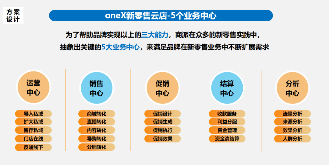 为了帮助品牌重构以上的3大数字化能力,商派在众多的新零售解决方案实践中,抽象出了新零售云店关键的5大业务中心,满足品牌在新零售业务中不断扩展的需求。