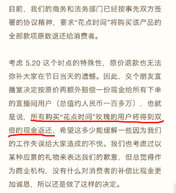 比如罗永浩作为资深营销大师,他深知品牌信任意味着什么,因此在售后服务方面从来不缩水。当消费者在直播间购买鲜花发现有问题时,他不退不让不逃避,立刻做出双倍现金返还的补偿。