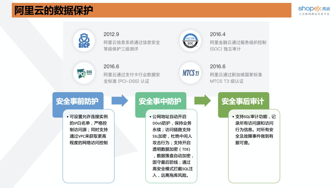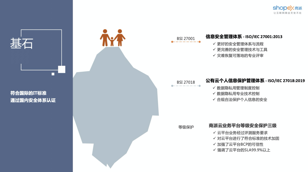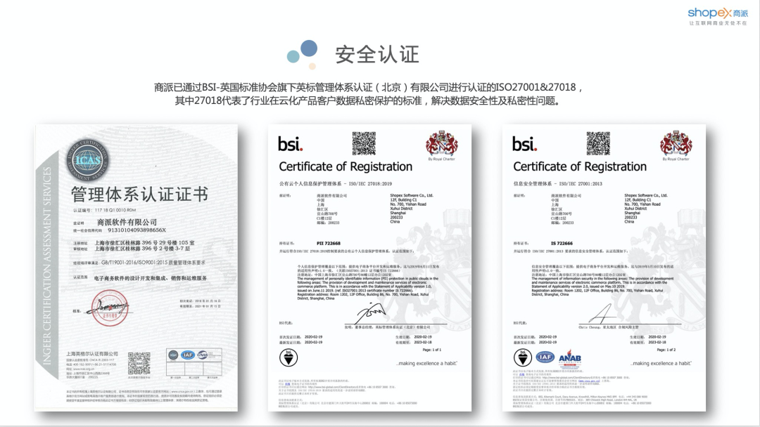 商派已通过BSI-英国标准协会旗下英标管理体系认证(北京)有限公司进行认证的ISO27001&27018,其中27018代表了行业在云化产品客户数据私密保护的标准,解决数据安全性及私密性问题。