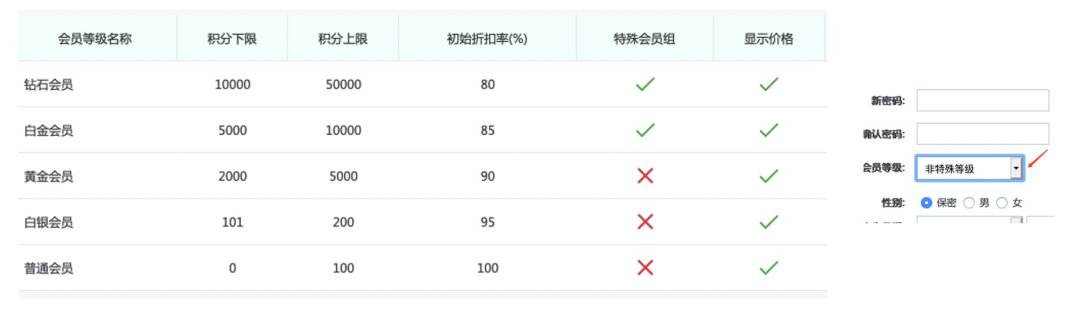 ECShop支持多等级会员,各等级之间升级时可基于等级积分自动升级;会员等级可设置折扣率,设置后,对所有商品生效;会员等级数量无限制;支持特殊会员组,特殊会员组的会员不随积分变化而变化,是固定的;可修改会员的会员等级;