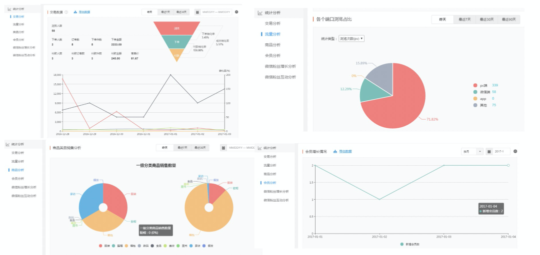 来自交易、流量、商品、会员的数据分析,搭载多种统计图。让数据更直观的体现,掌控全商城动态不再困难!